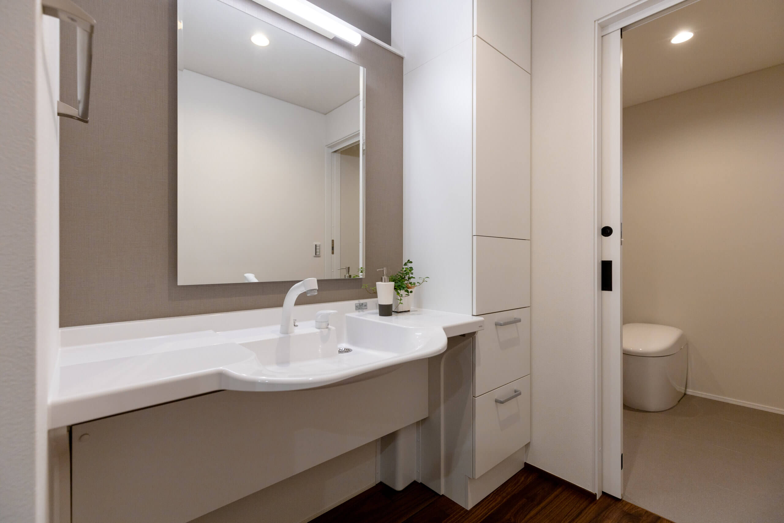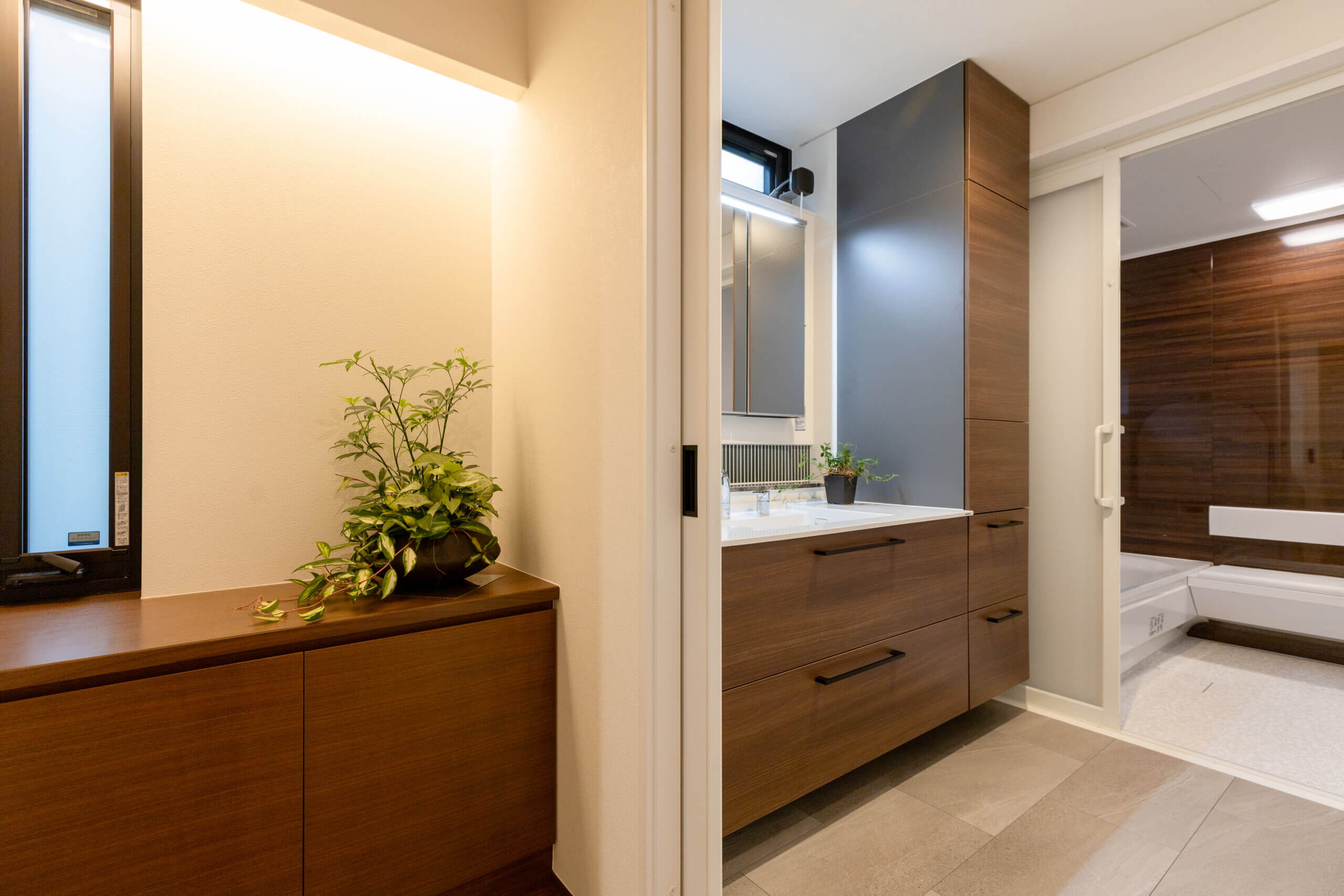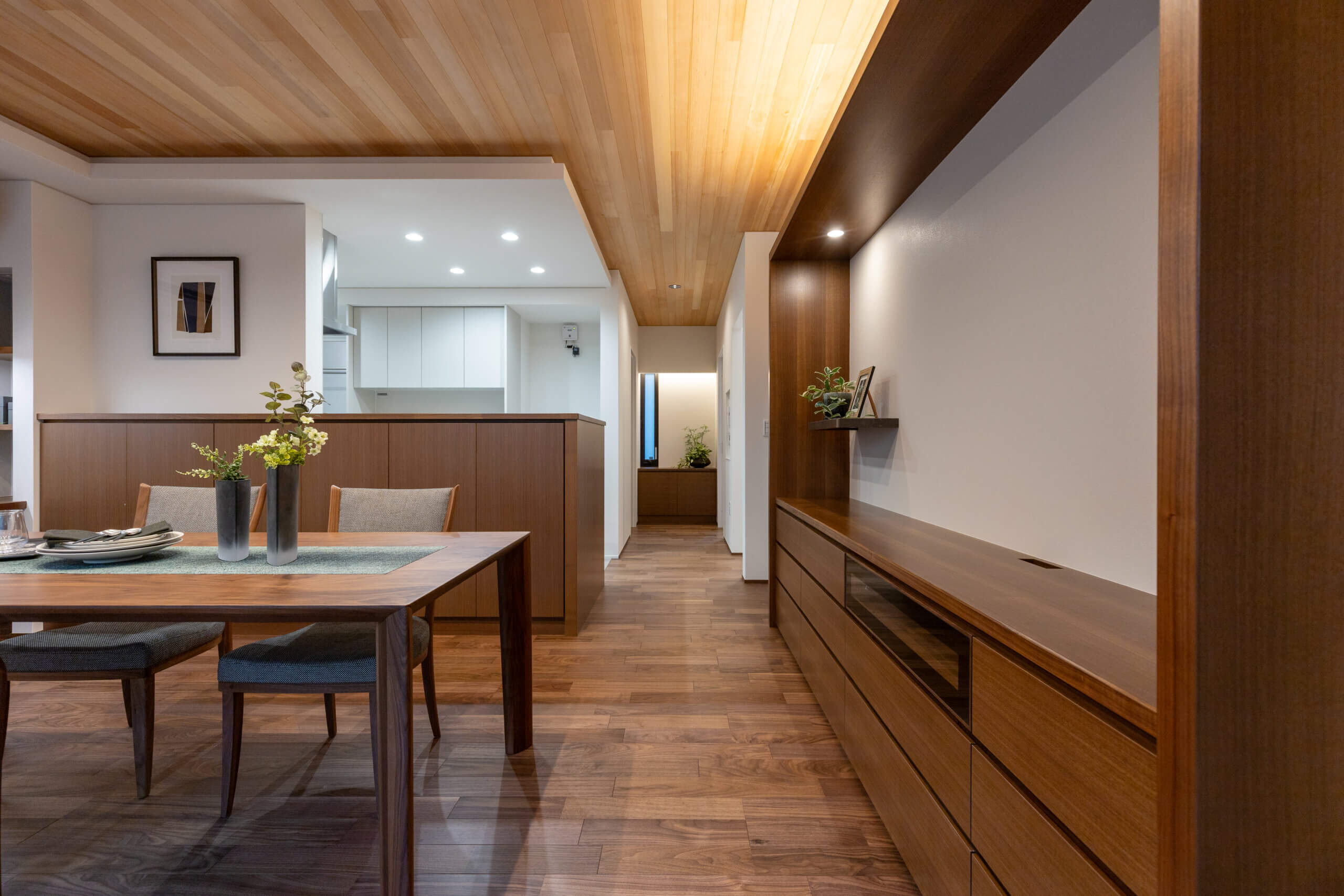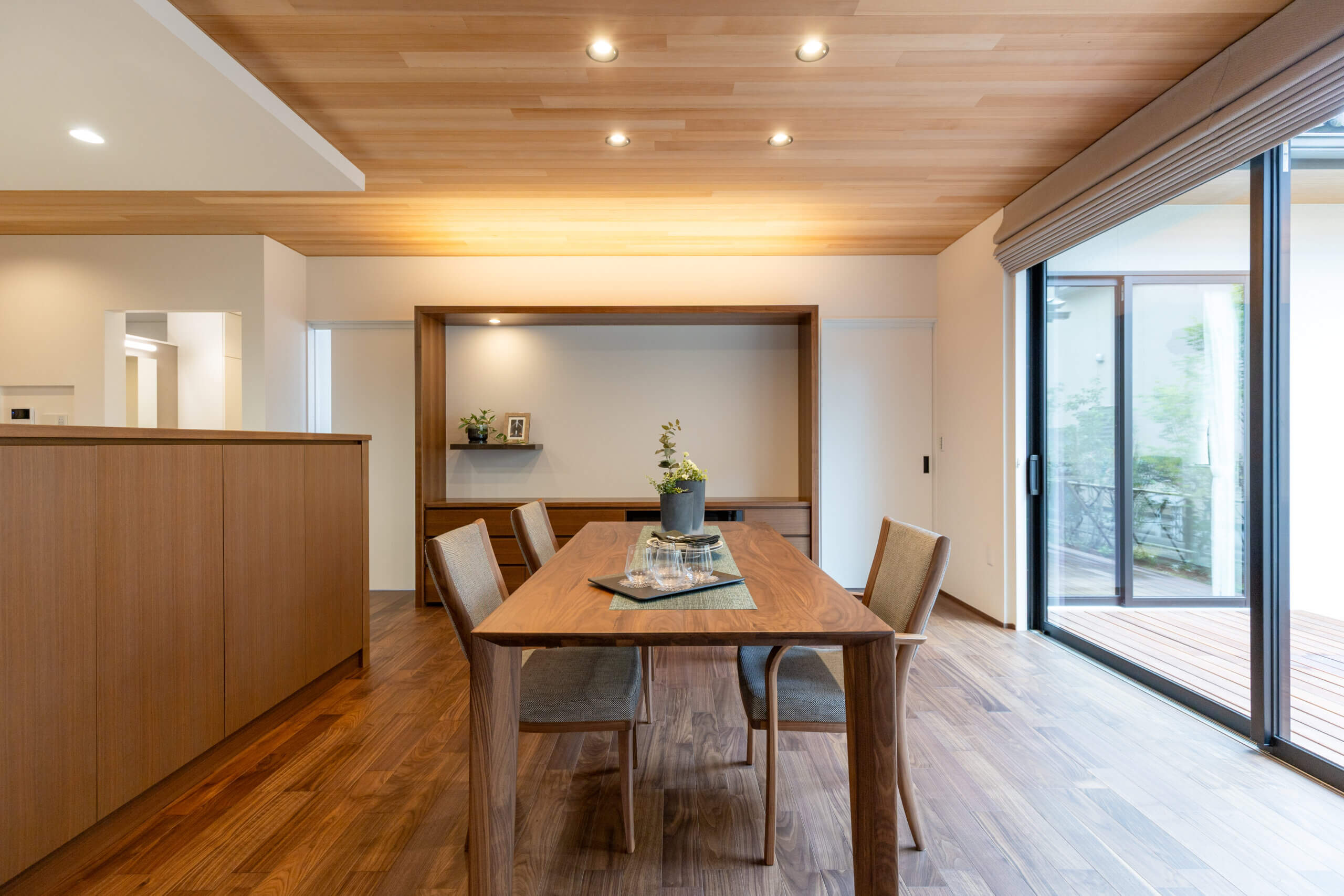 住みやすく、使いやすく、 車庫からの動線、幅広な通路や収納。 設計の工夫から家族の暮らしかたの知恵が伝わる。 皆が集えるリビング・ダイニングを中心に それぞれの部屋へ段差なくアクセスできる平屋プラン。 家族の絆を深め、優しさに溢れた心地よさは、 時とともに美しく育ち、深い味わいが紡がれる。