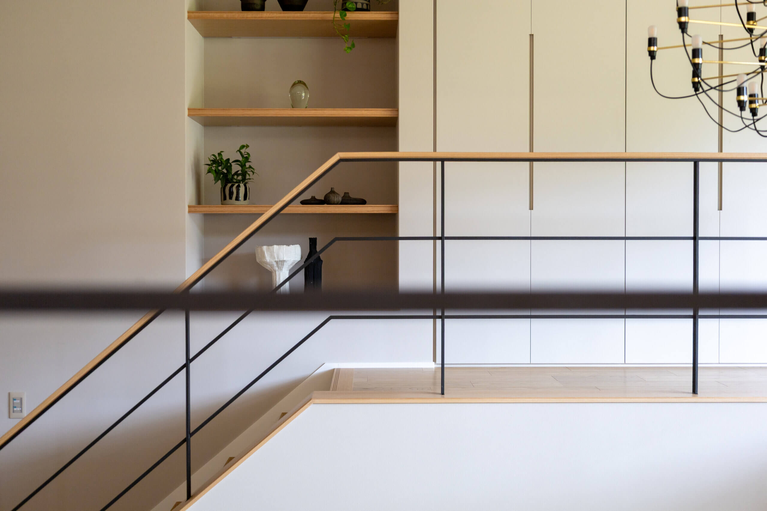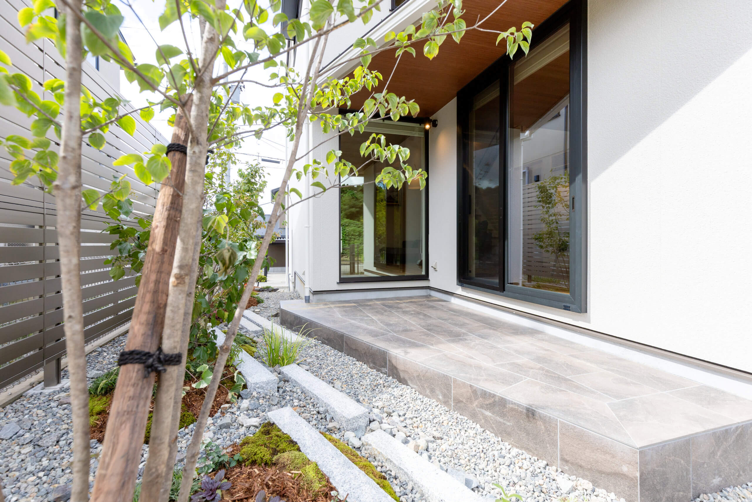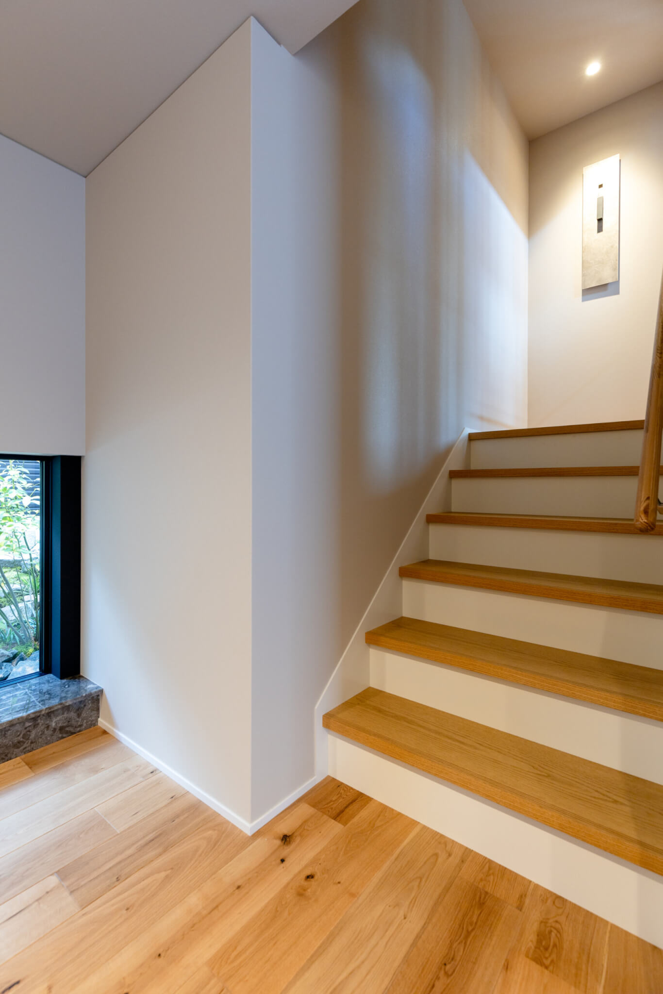 敷地形状から読み取り、玄関を入った正面に 高低差を利用した坪庭が「粋」に映える。 内部空間はいくつもの高さの違う床が織りなす スキップフロアで吹き抜けのある豊かな空間となっている。 3つのボリュームがリズムを生むビルトインガレージの アーバンスタイルは新しい街の景観を創り出す。
