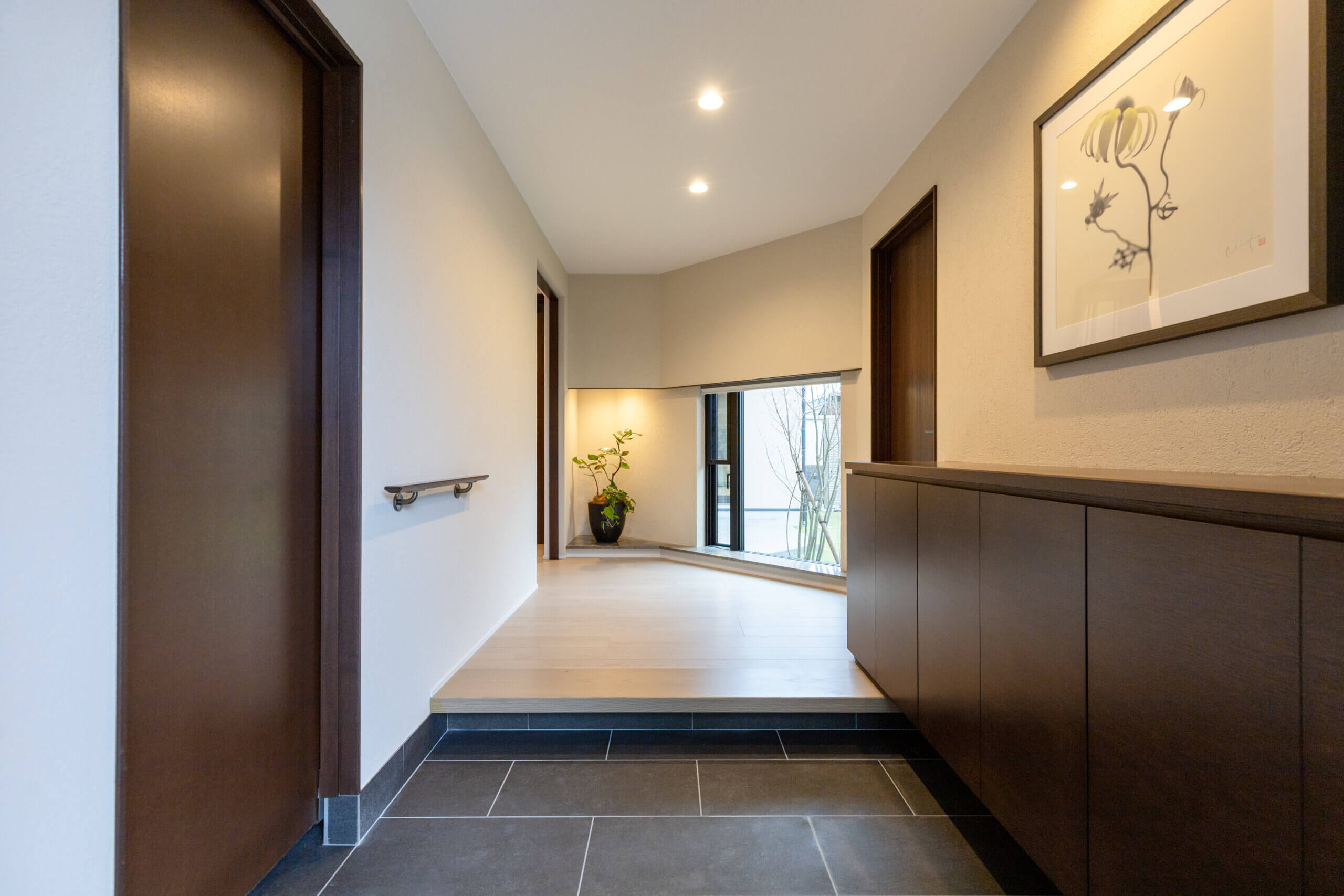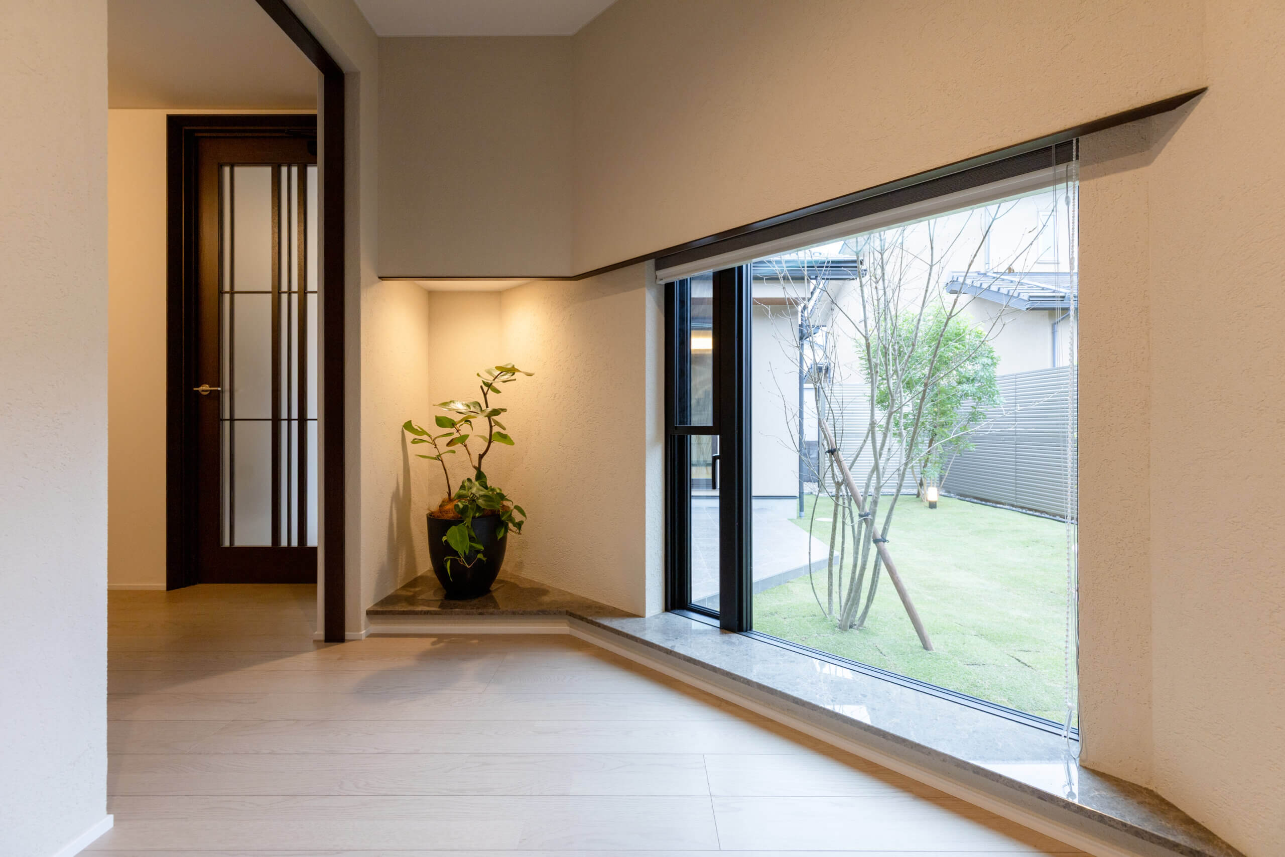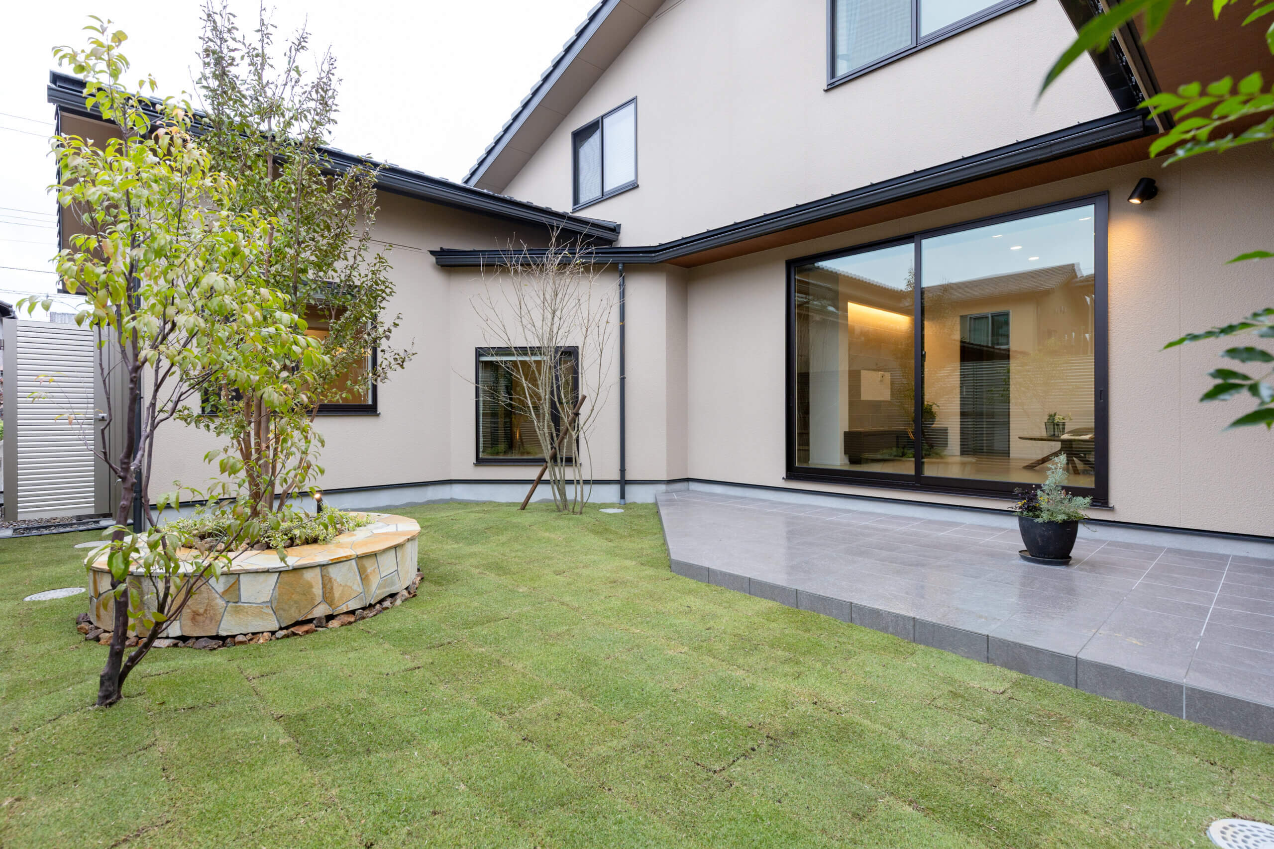 玄関は自然光が入ることと植栽が眺められるように、家族で楽しめる庭とテラスを配置し、