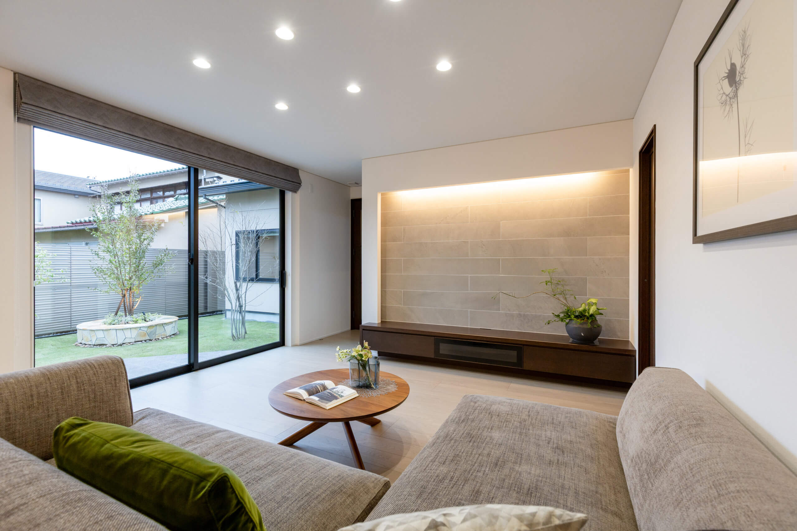 隣地の庭の位置も鑑み空へ視線が伸びるように工夫。