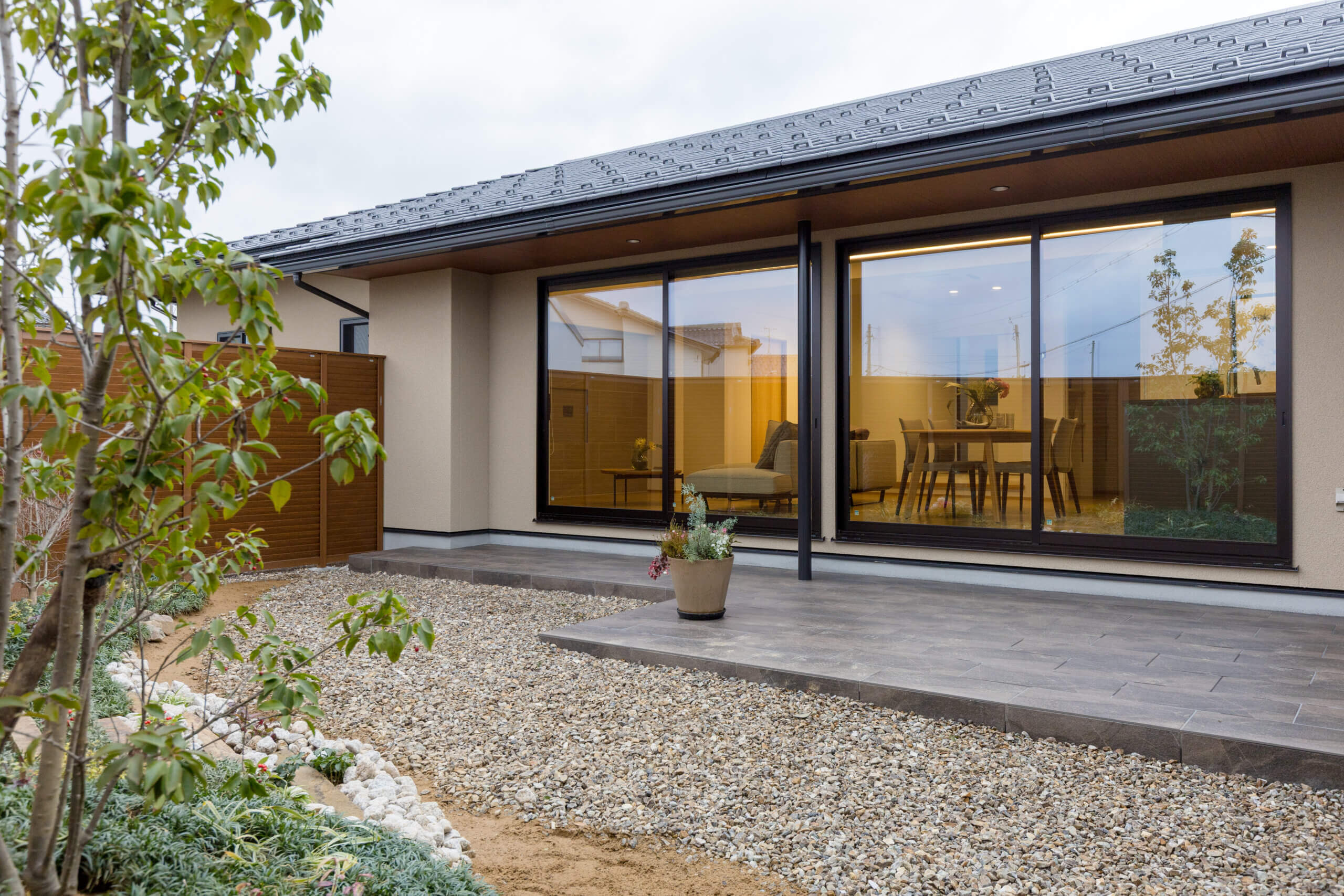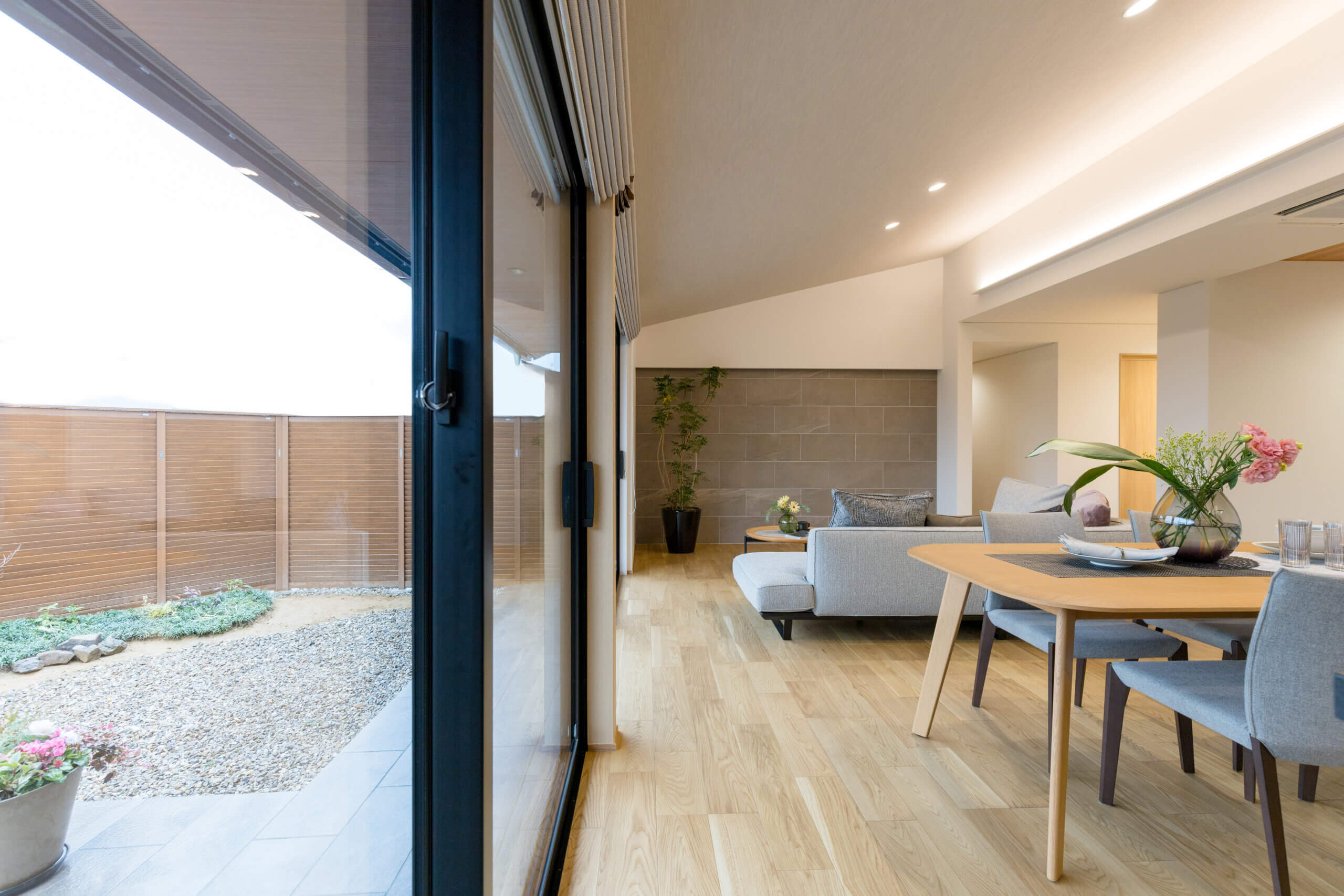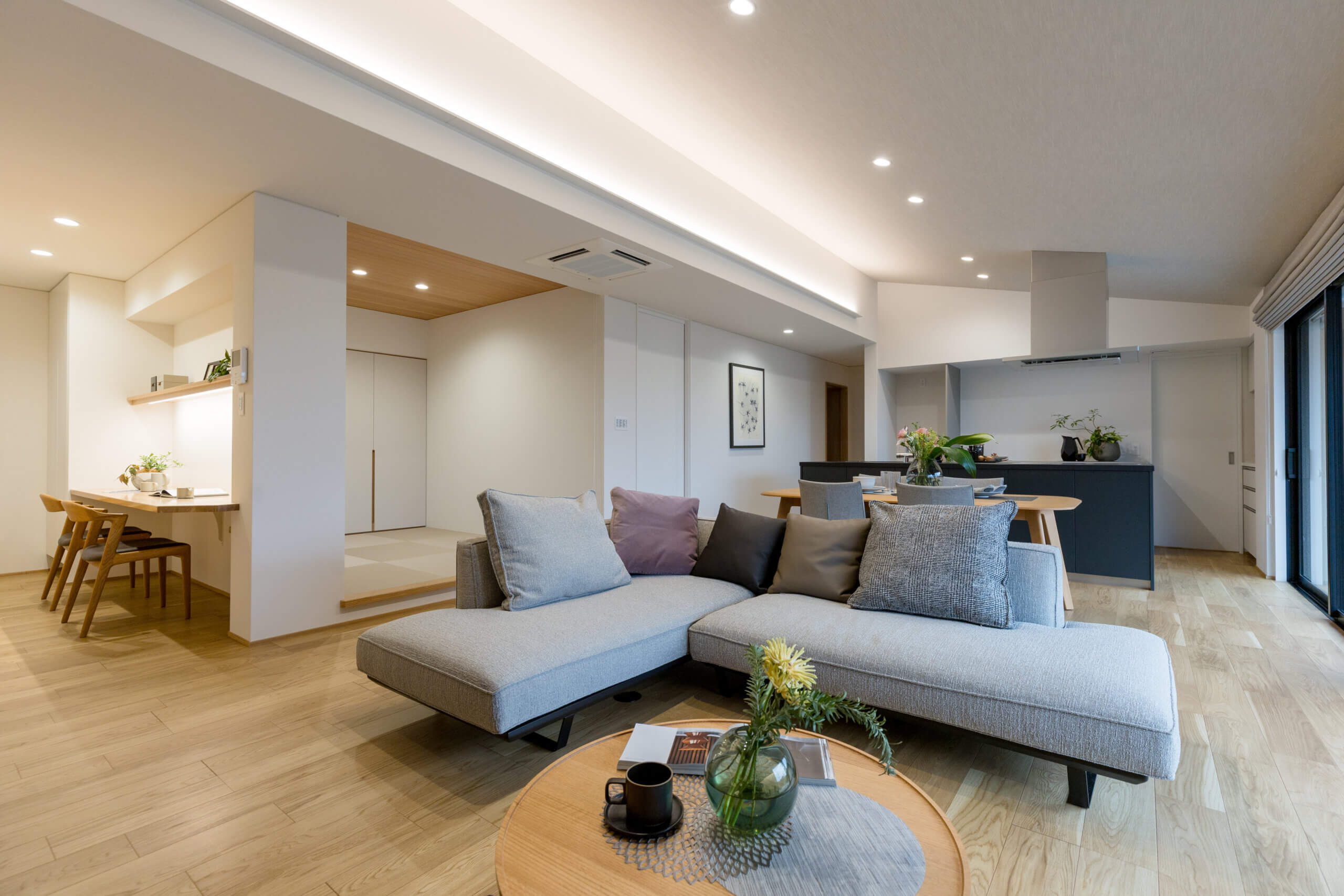 家族が 心地よくつながる 中庭の家 グランドスタイル~玉家の平屋~ こだわりLDK こだわり玄関・ホール 子育て世帯 庭・テラス 勾配天井・吹き抜け サードプレイス 家事動線・生活収納 和室 詳細はこちら