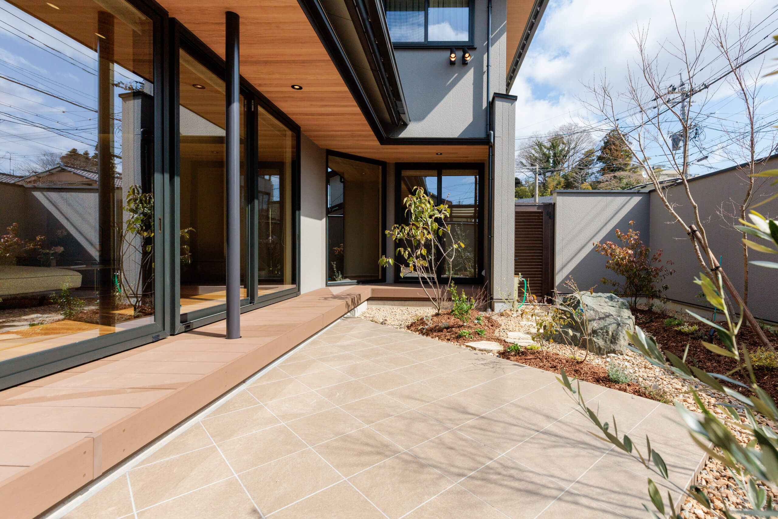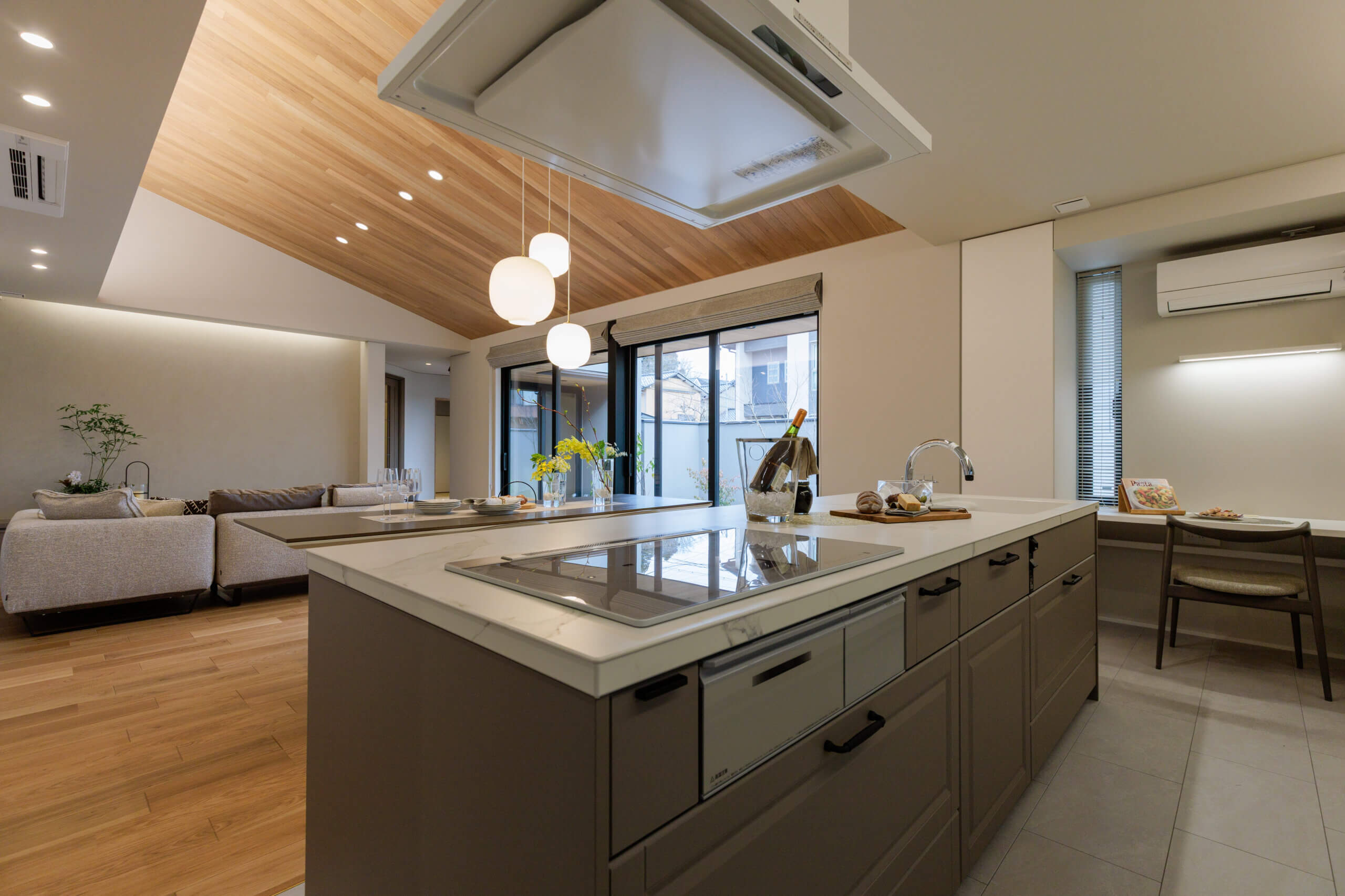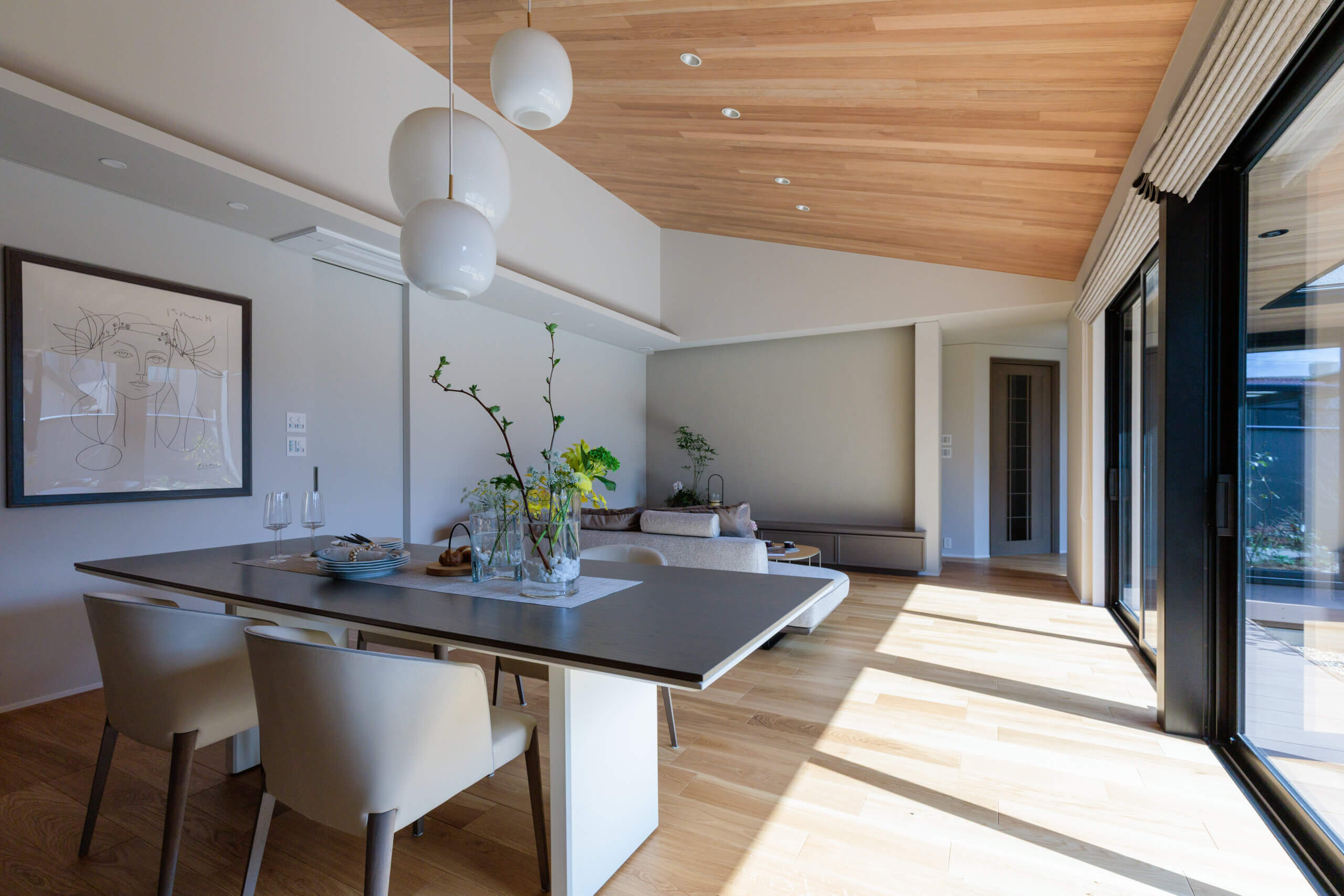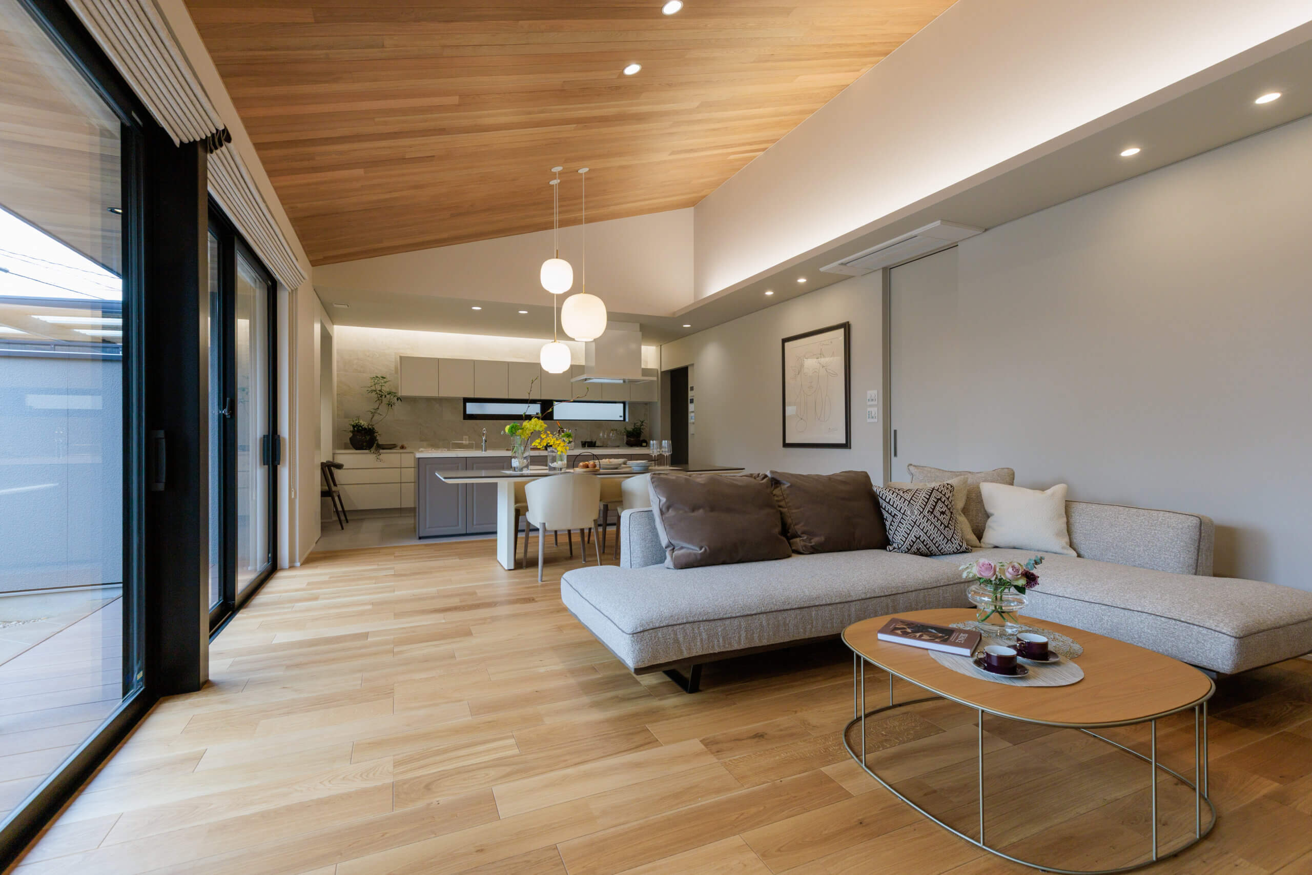 庭から広がるように羽目板貼勾配天井は