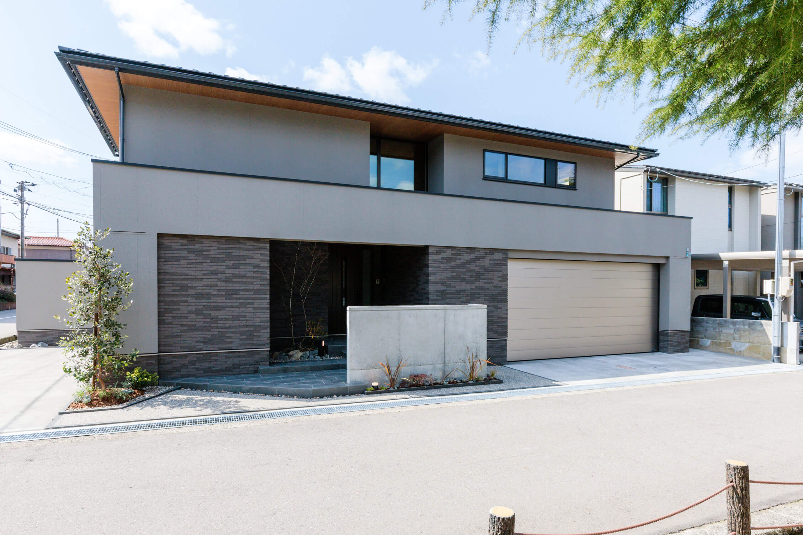 角地に映える水平ラインの美しいゲートと寄棟屋根の