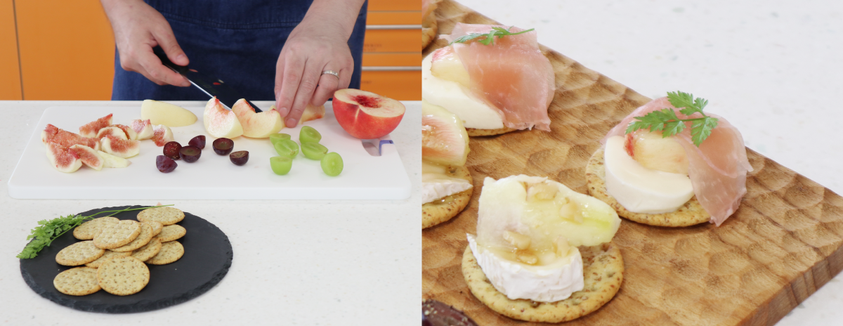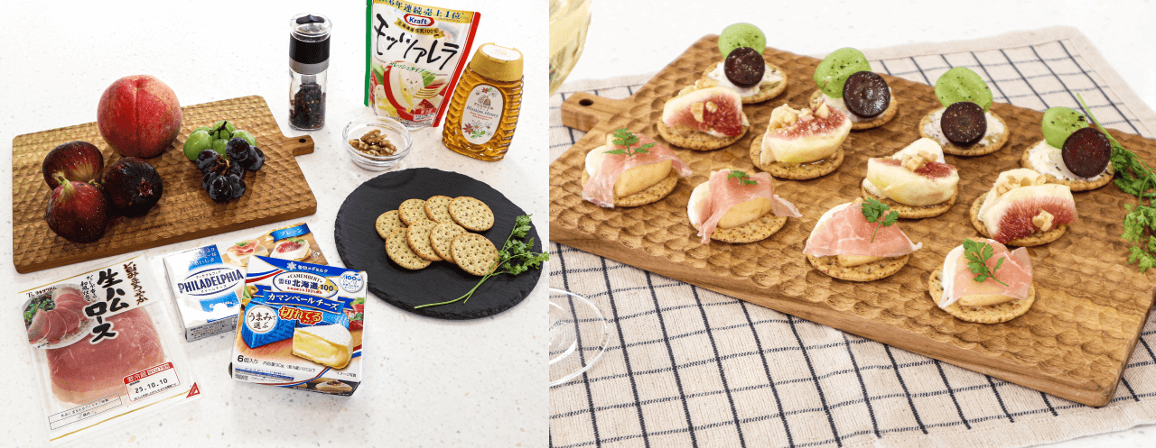 クラッカーにカマンベールチーズをのせ、スライスしたいちじくとくるみをトッピング。上品な甘みのいちじくと濃厚なカマンベール。香ばしいくるみにはちみつを合わせれば、贅沢なひと口に。