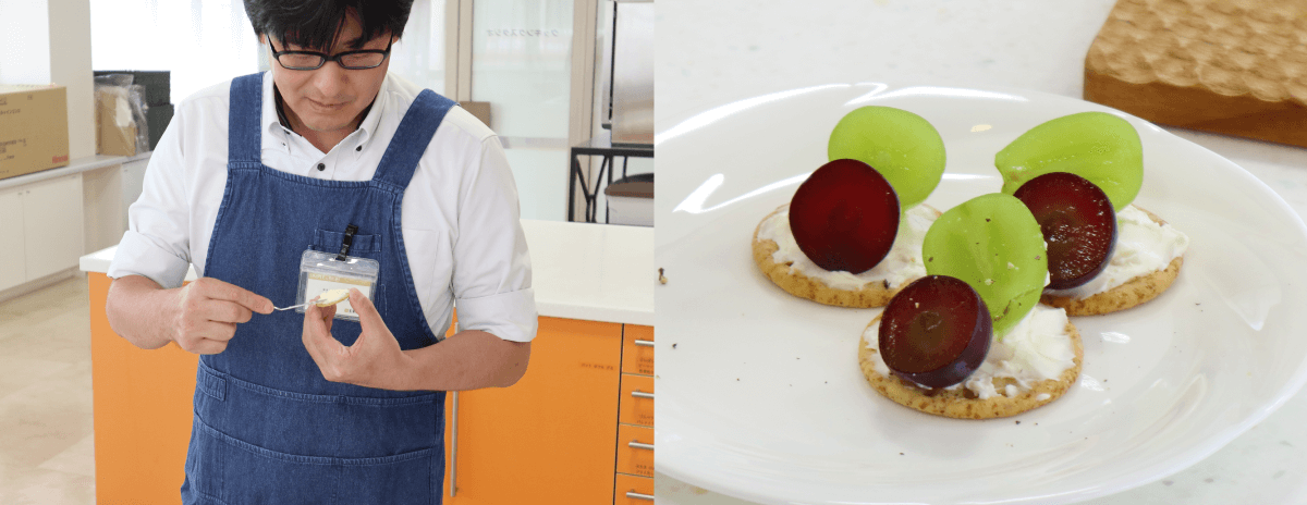 クラッカーにクリームチーズを塗り、半分に切ったぶどうをのせて胡椒をパラリ。ぶどうの爽やかな甘みとクリームチーズのまろやかな酸味とコクのバランスが絶妙!
