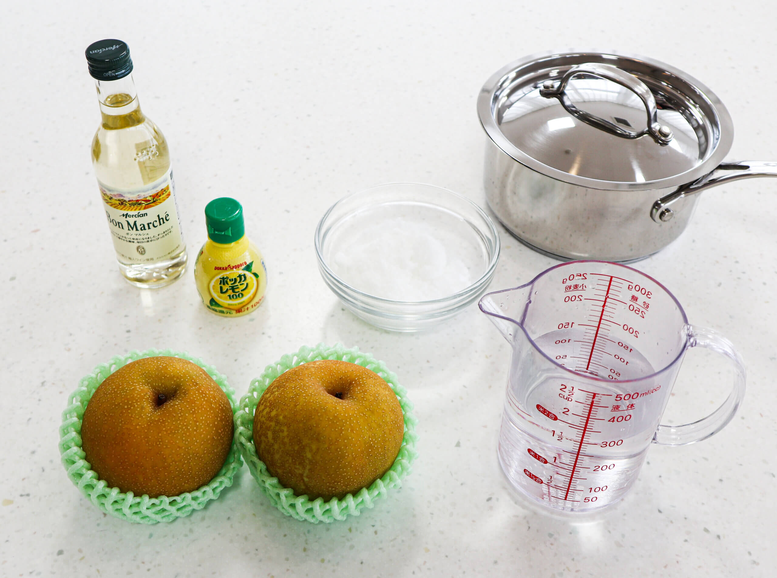 ① 梨は皮をむき、4~6等分に切って芯を取る