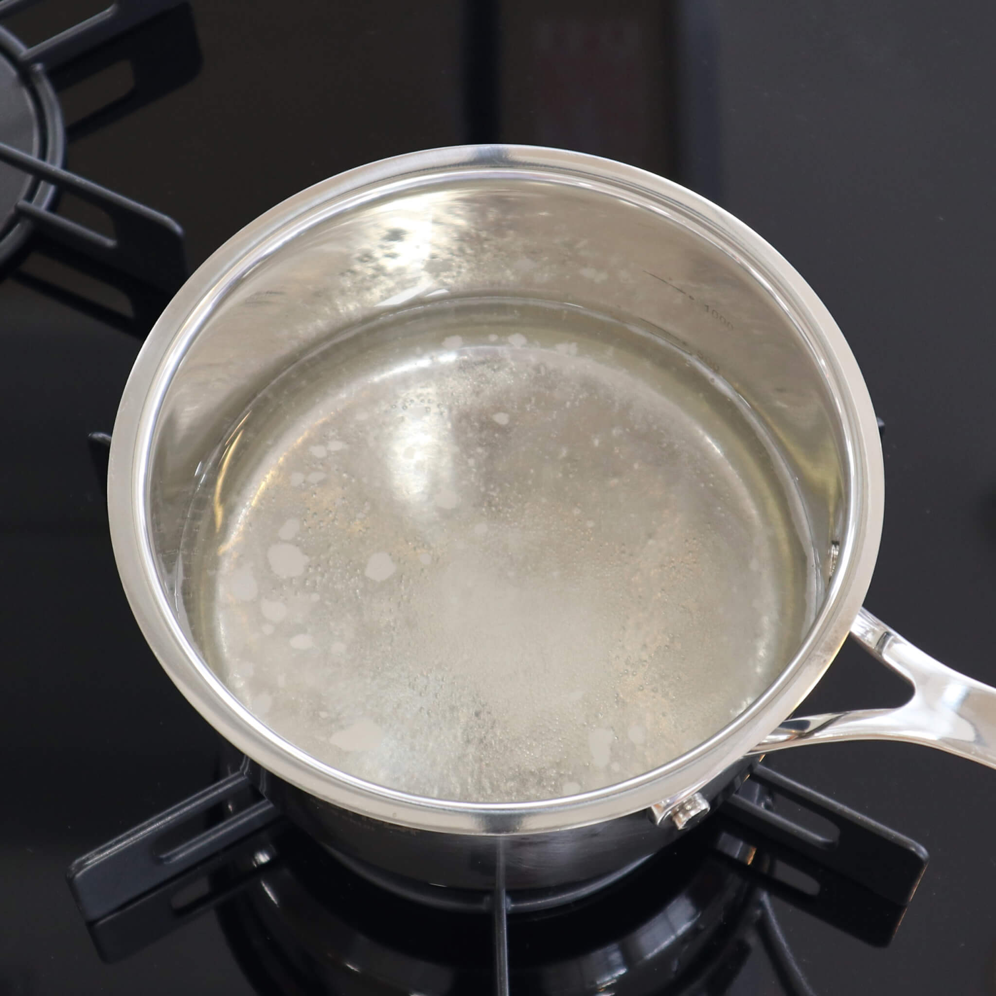 ② 鍋に水・砂糖・白ワイン・レモン汁を入れて火にかける