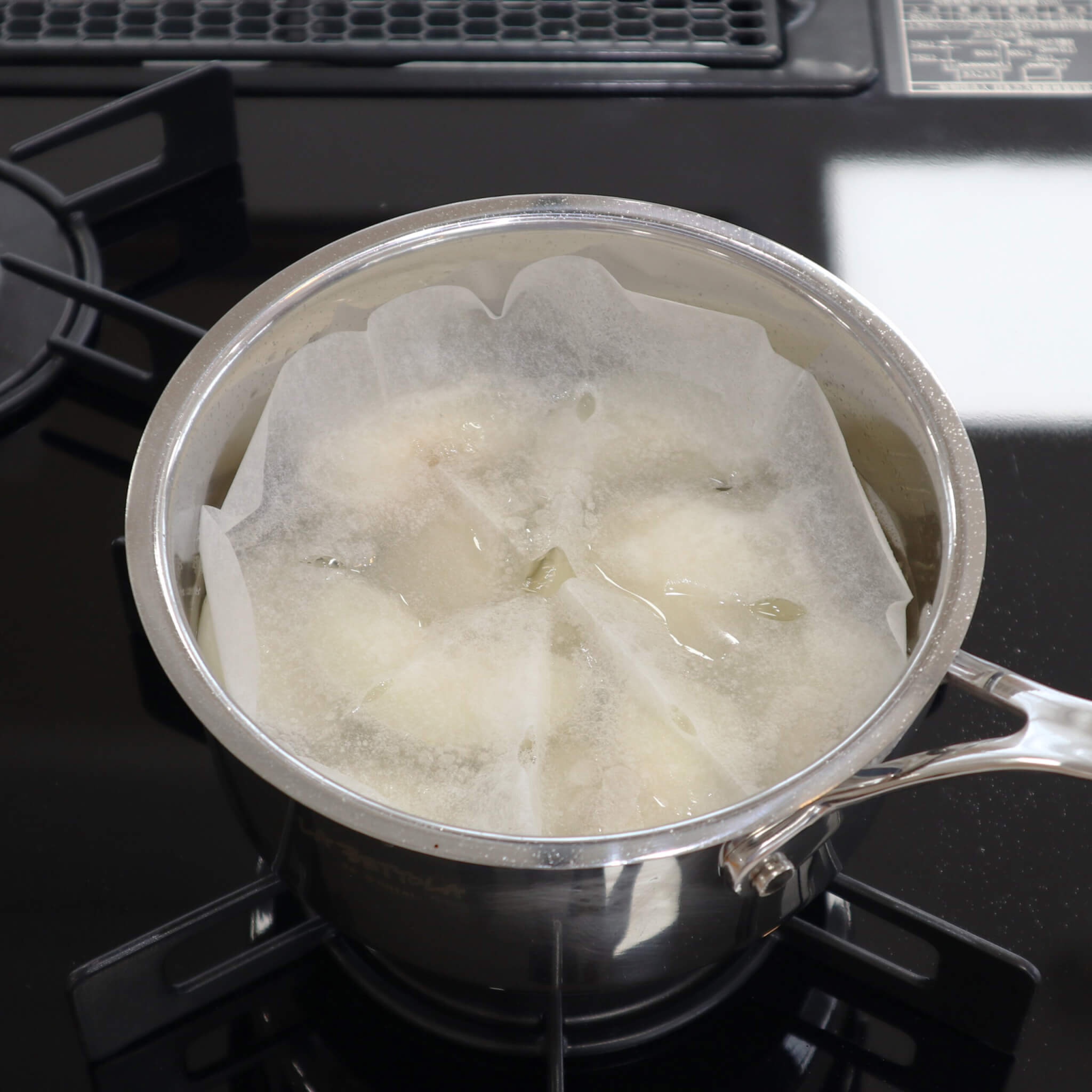 ③ 煮立ったら梨を加え、落し蓋をして弱火で15分ほど煮る