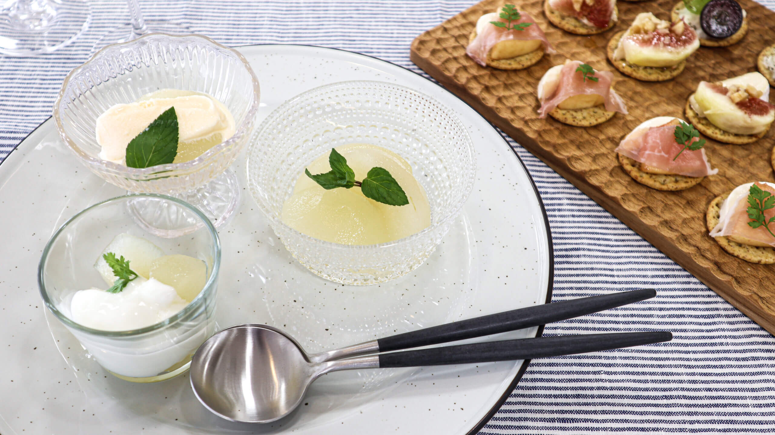 薄切りの桃とモッツァレラチーズ、生ハムを重ね、仕上げにオリーブオイルをひとたらし。桃のやさしい甘みとクセのないモッツアレラ、生ハムの塩味で白ワインにピッタリな味わいに。