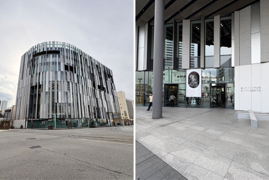 図書館が併設された「TOYAMAキラリ」は立山の氷の岩脈をイメージした外観で、
