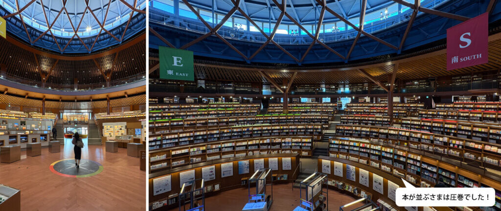 建物に入ると吹き抜けの大空間と、それを支える木の梁構造に目を奪われます。この先はどんな空間が広がっているのだろうと、わくわくした気持ちになりました。