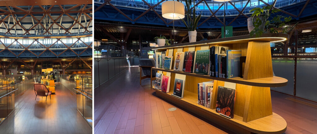 上階に行くとブリッジと呼ばれる空間があり、座り心地の良いソファと間接照明がお洒落な本棚があります。まるで空中に浮いたリビングのようでした。