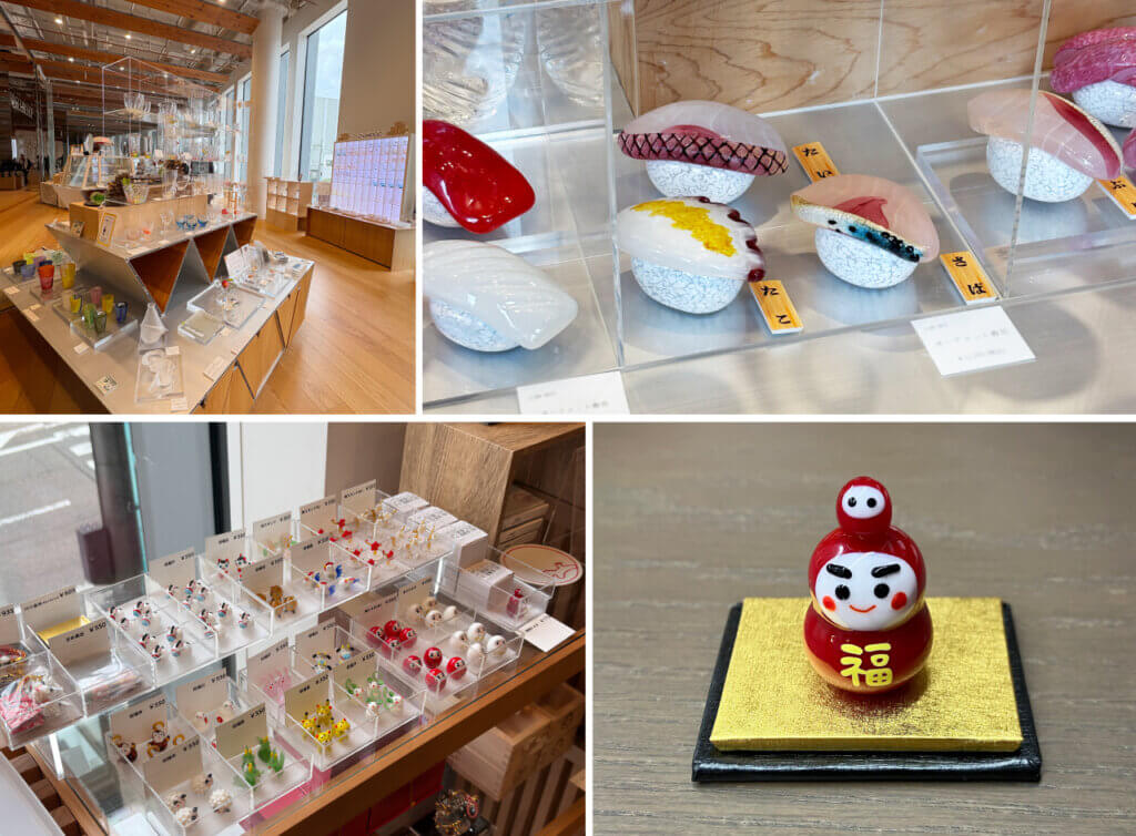 さまざまな装飾品や、富山ならではのガラスでできたお寿司や小物が並んでおり、