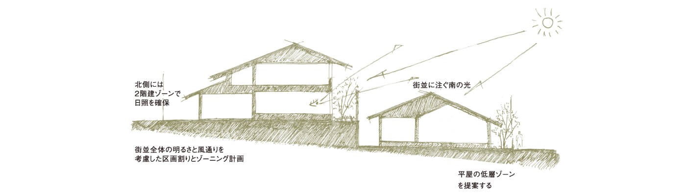 玉家住宅設計研究室では日の当たり方や敷地の高低差、周辺環境をよく観察し、敷地造成のゾーニングから検討を重ね、地盤の低い南側を平屋ゾーンに、地盤の高い北側を2階建ゾーンにゆとりを持って計画することで、この寺町台9区画の全住居に優れた採光と通風を確保し、街並みへの広がりを創出することを考えました。